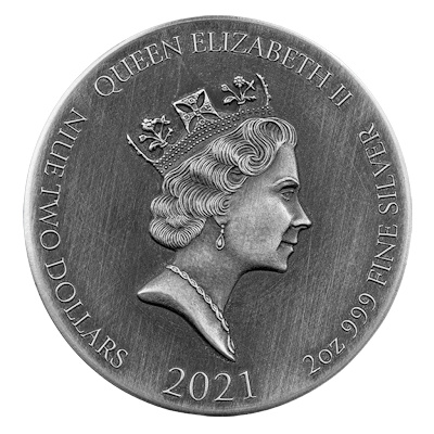 Technische Daten: Ausgabeland: Niue Prägeanstalt: Scottsdale Mint Ausgabejahr: 2021 Nennwert: 2 NZD Material: Silber Gewicht: 62,20600g Durchmesser: 39,00 mm Dicke: 7,00 mm Auflage: 1.499 Stück Prägequalität: HighRelief Prägung mit Antik Finish Verpackung: Im Original-Etui mit Umverpackung und Echtheitszertifikat |