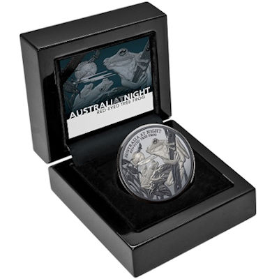 Diese 1 Oz Feinsilbermünze in Black Proof ist die 11. Ausgabe der Serie Australien bei Nacht und zeigt den Rotäugigen Laubfrosch. Die Auflage ist weltweit auf nur 1.000 Stück streng limitiert.