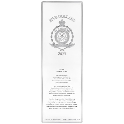 Technische Daten: Ausgabeland: Niue Prägeanstalt: New Zealand Mint Ausgabejahr: 2025 Nennwert: 5 NZD Material: Silber Gewicht: 93,30900g Durchmesser: 100,00 x 34,60 mm Auflage: 800 Stück Prägequalität: Polierte Platte, coloriert Verpackung: im Original-Etui und Echtheitszertifikat |