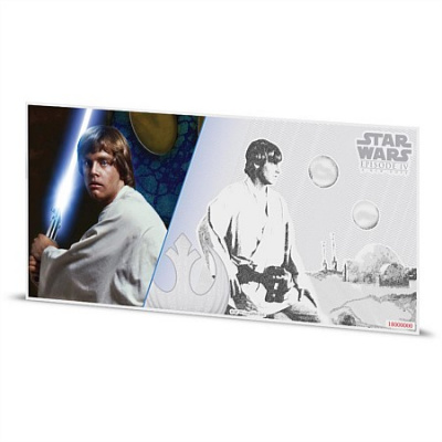 Es handelt sich hier um die Erstausgabe der Star Wars Eine Neue Hoffnung (A New Hope) Silberbanknoten Kollektion und zeigt auf Feinsilber verewigt Luke Skywalker.