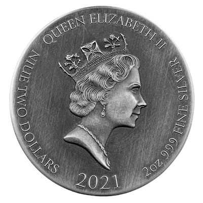 Technische Daten: Ausgabeland: Niue Prägeanstalt: Scottsdale Mint Ausgabejahr: 2021 Nennwert: 2 NZD Material: Silber Gewicht: 62,20600g Durchmesser: 39,00 mm Dicke: 7,00 mm Auflage: 1.499 Stück Prägequalität: HighRelief Prägung mit Antik Finish Verpackung: Im Original-Etui mit Umverpackung und Echtheitszertifikat |