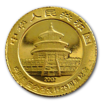 Es handelt sich hier um eine Panda Prägung aus dem 25 Jahre Gedenkset mit einem Feingewicht von 1/25 Oz Feingold und einem Nennwert von 15 Yuan. die Münze besteht aus 999er Feingold. Das Motiv zeigt den Panda der ursprünglich 1997 verwendet wurde. Alle Motive aus diesem Set tragen die Jahreszahl 2007, in dem das Jubiläumsset erschienen ist, mit einer Auflage von nur 18.000 Stück.