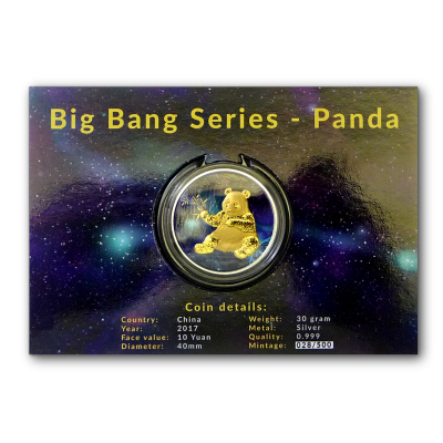 Der 2017er Silber Panda in der Big Bang Series Ausgabe ist wunderschön coloriert, zudem 24-Karat vergoldet und kommt gekapselt im nummerierten Original-Blister. Die Münze besteht aus 30 Gramm Silber in 999er Reinheit und hat einen Durchmesser von 40 mm sowie einen Nennwert von 10 Yuan.