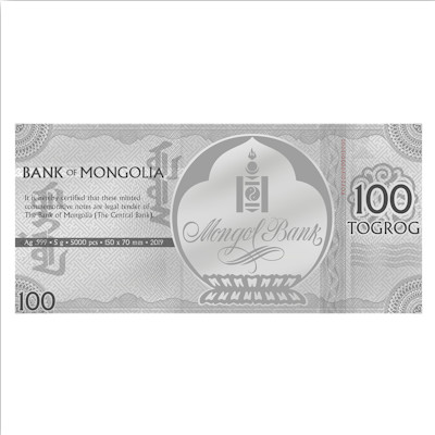 Zum Jahr des Schweins 2019 bringt die Mongolei zu ihrer bestehenden Lunar Serie erstmals auch eine Silberbank-Note mit dem Nennwert von 100 Togrogs heraus. Die Ausgabe ist auf nur 5.000 Stück limitiert.