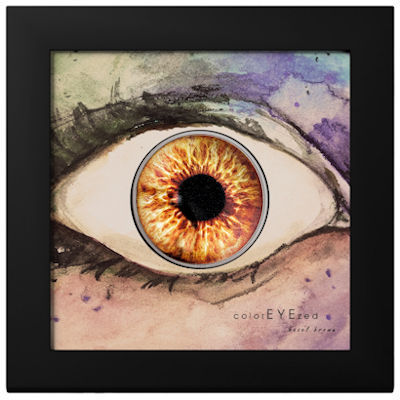 <<< Palau - 5 USD ColorEYEzed Hazel Brown - 1 Oz Silber PP Color | |