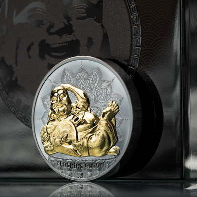 Die fröhliche Lachende-Buddha-Münze aus 2017, geprägt in HighRelief, um seinem großen Bauch gerecht zu werden, war schnell ausverkauft und bleibt ein begehrtes Sammlerstück. Zum Glück weiß der lachende Buddha, wie man eine Pose macht und Sammler werden erfreut sein über die 2. Ausgabe der Serie. Dieses Mal zeigt sich Buddha mit einem Fächer oder Oogi in seiner Hand, der Glück und Zufriedenheit darstellt. Der Ventilator weht alle Sorgen weg. Durch die Vergoldung des Buddhas und die Prägung in Black Proof wird das Motiv besonders kontrastreich in Szene gesetzt.
