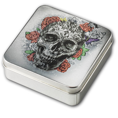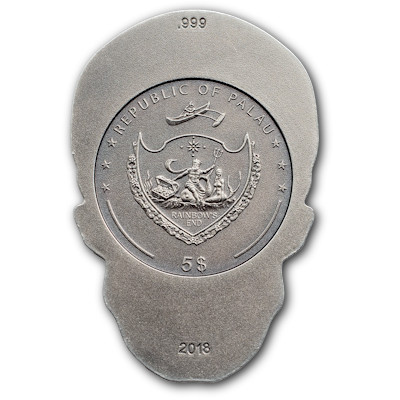 Es handelt sich hier um die 3. Ausgabe der Serie, nach Totenkopf und Piratentotenkopf nun den La Catrina Skull in 1 Oz Feinsilber und in Antik Finish veredelt. Durch die Rückseiten Prägung handelt es sich um eine Münze und gesetzliches Zahlungsmittel in Palau mit einem Nennwert von 5 Dollar. Die Auslieferung erfolgt im Original-Etui mit Umverpackung und Echtheitszertifikat. Die Auflage beträgt lediglich 1.750 Stück weltweit.