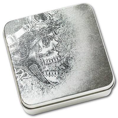 Es handelt sich hier um die 4. Ausgabe der Serie, nach Totenkopf, Piratentotenkopf, La Catrina Skull nun den Biker Skull oder Biker Totenkopf in 1 Oz Feinsilber und in Antik Finish veredelt. Durch die Rückseiten Prägung handelt es sich um eine Münze und gesetzliches Zahlungsmittel in Palau mit einem Nennwert von 5 Dollar. Die Auslieferung erfolgt im Original-Etui mit Umverpackung und Echtheitszertifikat. Die Auflage beträgt lediglich 1.750 Stück weltweit.