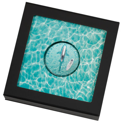 Eine völlig geniale Neuinterpretation einens beliebten Münzmotivs ist CIT mit dieser Neuausgabe aus dem Ausgabeland Palau gelungen. Es zeigt den Great White Shark, den großen Weißen Hai der uns in etlichen Kinofilmen schon das fürchten gelernt hat auf eine ganz neue plastische Weise. So ragt der Hai aus dieser 1 Oz schweren Feinsilbermünze heraus, sowohl auf der Ober- als auch auf der Unterseite, während die Badenixe noch nichts ahnend auf ihrer Luftmatrazte die Sonne genießt. Die Ausgabe ist auf nur 2.021 Stück weltweit streng limitiert und beim Hersteller bereits komplett ausverkauft!