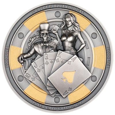 Eine meisterhafte Verschmelzung von Zweckmäßigkeit und Kunsthandwerk bietet der stilvolle Poker Card Guard. Als Schutz vor unerwünschten Blicken oder zufälliger Enthüllung der Spielkarten ist er für Poker Enthusiasten wie geschaffen. Unser Augenmerk fällt auf die verführerische Dame, die stolz ihre Karten präsentiert, sowie den elegant gekleideten Sensenmann, der teilweise von den Pik Karten des Royal Flush verdeckt wird. Den Hintergrund bildet ein kunstvoll gestalteter, teilweise vergoldeter Pokerchip mit den Inschriften Shuffle up and deal und Good Luck. Der Poker Card Guard raffiniert gefertigt, vereint er gekonnt Handwerkskunst mit Funktionalität. Ein Muss für das Repertoire eines jeden Pokerspielers. Die Auflage dieser 1 Oz Feinsilbermünze ist weltweit auf nur 1.111 Stück streng limitiert. Die Auslieferung erfolgt gekapselt im Original-Etui mit Echtheitszertifikat. |