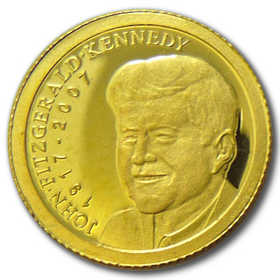 Zum 90. Geburtstag (1917-2007) von John F. Kennedy wurde diese Gedenkmünze von Palau mit einem Nennwert von 1 Dollar und einem Feingewicht von 0,5 Gramm Gold verausgabt. Die Auflage beträgt lediglich 15.000 Stück weltweit und die Auslieferung erfolgt gekapselt. |
