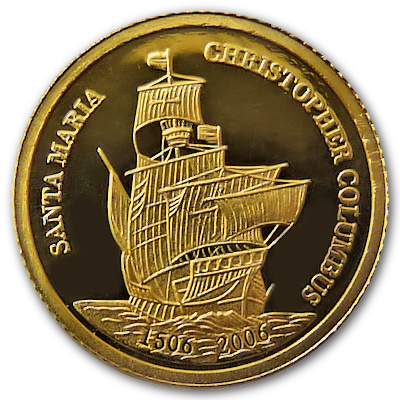 Anlässlich des 500. Todestags von Christopher Columbus wurde diese 99999er Feingoldmünze mit dem Motiv des Segelschiffs Santa Maria verausgabt. Die Münze besteht aus 0,5g Feingold in der höchsten Prägequalität Polierte Platte, trägt das Ausgabeland Palau und hat einen Nennwert von 1 USD. |