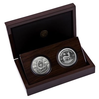 Es handelt sich hier um das Leopard & Krügerrand Silber Set aus der Big Five II Serie und beinhaltet das Big Five II Lion in 1 Oz Silber sowie einen Krügerrand mit exclusiven Leopard Privy Mark. Die Auslieferung erfolgt im Original-Etui mit Umverpackung und nummeriertem Echtheitszertifikat. |