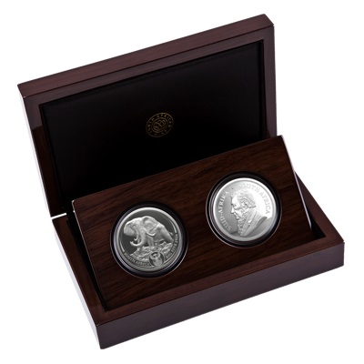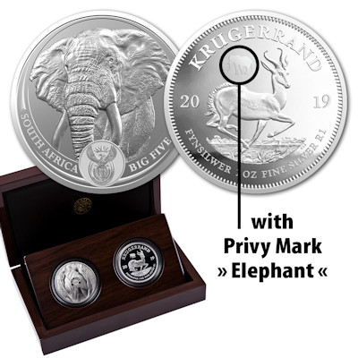 Südafrika - 6 Rand Big Five Elefant / Krügerrand 2019 - 2*1 Oz Silber Proof Set | ||