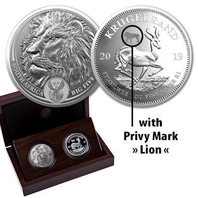 Dieses edle Set beinhaltet nicht nur die Löwen Ausgabe der BigFive Serie sondern auch den Silber Krügerrand von 2019 mit Privymark Löwe. Das Set ist auf nur 750 Stück weltweit streng limitiert und der Krügerrand in Polierter Platte mit einmaligem Privymark Elefant dürfte zudem jedes Sammlerherz höher schlagen lassen, ein echtes Sammlerstück das nur in extrem geringer Auflage verausgabt wurde! |