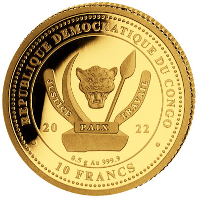 Technische Daten: Ausgabeland: Kongo Prägeanstalt: Diverse Ausgabejahr: 2022 Nennwert: 10 Francs Material: Gold Gewicht: 0,50000g Durchmesser: 11,00 mm Auflage: 5.000 Stück Prägequalität: Polierte Platte Verpackung: Gekapselt |
