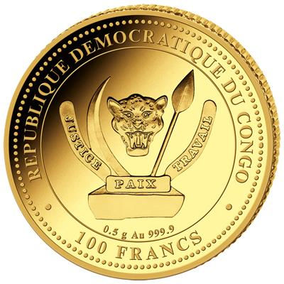 Technische Daten: Ausgabeland: Kongo Prägeanstalt: Ausgabejahr: 2023 Nennwert: 100 Francs Material: Gold Gewicht: 0,50000g Durchmesser: 11,00 mm Auflage: 2.000 Stück Prägequalität: Polierte Platte Verpackung: Gekapselt |