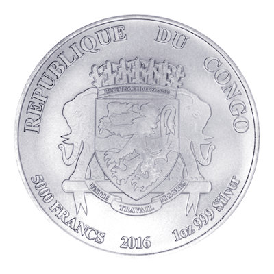 Technische Daten: Ausgabeland: Kongo Prägeanstalt: Diverse Ausgabejahr: 2016 Nennwert: 5000 Francs Material: Silber Gewicht: 31,10300g Durchmesser: 38,43 mm Auflage: 50.000 Stück Prägequalität: Stempelglanz Verpackung: In Münztasche mit Zertifikat |
