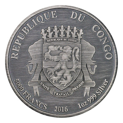 Technische Daten: Ausgabeland: Kongo Prägeanstalt: Diverse Ausgabejahr: 2016 Nennwert: 5000 Francs Material: Silber Gewicht: 31,10300g Durchmesser: 38,43 mm Auflage: 500 Stück Prägequalität: Antik Finish Verpackung: Gekapselt mit Zertifikat |