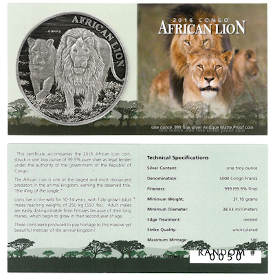 Diese Silbermünzen Serie trägt das Ausgabeland Kongo und einen Nennwert von 5.000 Francs und ist damit gesetzliches Zahlungsmittel im Ausgabeland. Das passende Motiv zeigt den afrikanischen Löwen mit einem männlichen und einem weiblichen Tier. Aus der Serie sind erschienen die Variante in Stempelglanz limitiert auf 50.000 Stück, sowie Ausgaben in Proof (1.000 Stück), vergoldet (500 Stück) und mit Antik Finish Veredelung (500 Stück). Die Münzen bestehen jeweils aus 1 Oz Feinsilber und alle Ausgaben werden mit Echtheitszertifikat ausgeliefert.