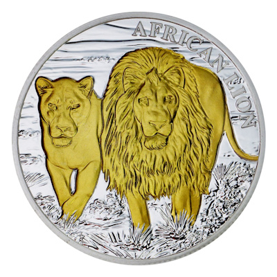 Vom Ausgabeland Kongo stammt diese beeindruckende Münze mit dem Motiv des Afrikanischen Löwen in 1 Oz Feinsilber mit der Reinheit 999/1000. Die Münze ist in der höchsten Prägequalität Polierte Platte produziert und zudem aufwendig vergoldet. Die Auflage beträgt nur 500 Stück weltweit und ist damit streng limitiert. Das Motiv zeigt einen männlichen Löwen mit Mähne und ein weibliches Tier. Der Nennwert beträgt 5000 Francs. |