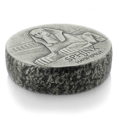 Diese beeindrucken 5 Oz schwere Feinsilbermünze zeigt die Sphinx von Matshepsut und es handelt sich um die 3. Ausgabe in 5 Oz Feinsilber der Serie Ägyptischen Relikte. Das detailreich gestaltete Motiv zeigt die Sphinx in voller Pracht. Die Münze hat einen Nennwert von 3.000 Francs und trägt das Ausgabeland Tschad. Produziert wurde sie in höchster Prägetechnik von der Scottsdale Mint und ist auf nur 20.000 Stück weltweit streng limitiert und mit Antik Finish veredelt. Die Auslieferung erfolgt im Original Etui der Prägeanstalt.