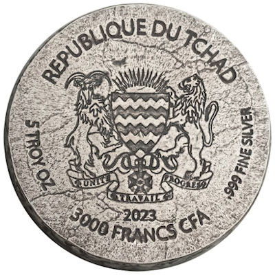 Technische Daten: Ausgabeland: Tschad Prägeanstalt: Scottsdale Mint Ausgabejahr: 2023 Nennwert: 3000 Francs Material: Silber Gewicht: 155,51500g Durchmesser: 41,00 mm Auflage: 2.000 Stück Prägequalität: Antik Finish Verpackung: einzeln in Münztasche |