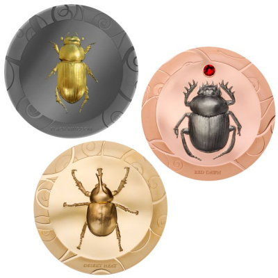 Dieses edle Skarabäus Silbermünzen Set hat es in sich, gleich drei edle Varianten der Münzprägung vereint in einem beeindruckenden Set, das nur 499 mal geprägt wurde und damit weltweit streng limitiert ist. Das Set beinhaltet 3 * 1 Oz Feinsilbermünzen in der Prägequalität Polierte Platte. Die Münze Black Kingdom ist zudem in Black-Proof veredelt und hochwertig vergoldet. Die Ausgabe Red Dawn ist komplett mit Rose-Gold vergoldet und der Skarabäus ist mit Black-Rhodium überzogen, zudem ist ein echtes Swarovski(R)-Elements eingesetzt. Die Ausgabe Desert Heat ist komplett vergoldet. Die Auslieferung erfolgt im Original-Aufsteller-Etui mit Kalvierlackoptik in Umverpackung mit Echtheitszertifikat.