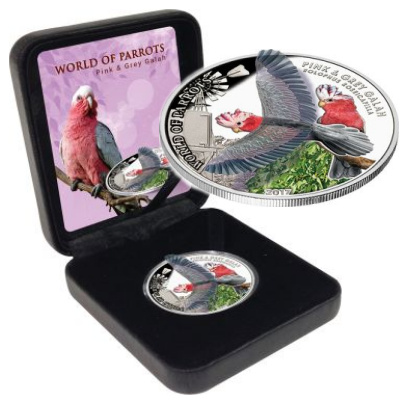 Diese wunderschöne Münze zeigt als 3D Applikation den Rosa Kakadu. Die Münze besteht aus Sterlingsilber und ist in der höchsten Prägequalität Polierte Platte produziert. Die Auslieferung erfolgt im Original-Etui mit Umverpackung und nummeriertem Echtheitszertifikat. Die Auflage beträgt lediglich 2.500 Stück weltweit!