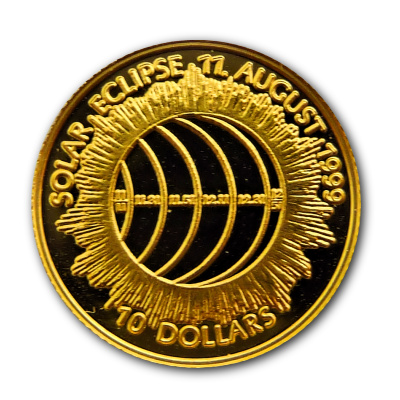 Diese 10 Dollar Goldmünze von den Cook Island wurde 1999 als Erinnerung an die Sonnenfinsternis am 11.08.1999 verausgabt. Die Münze besteht aus 999er Feingold und hat ein Feingewicht von 1/25 Oz. |
