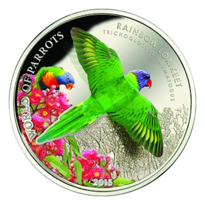 | Cook Island - 5 CID Regenbogenlori 2015 - 20g Silber Proof | ||
