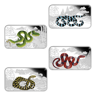 Es handelt sich hier um das 4er Barren Set zum Jahr der Schlange, ausgegeben von den Cook Islands und produziert von der Perth Mint Australia. Die aufwendig colorierten Barren kommen in der höchsten Prägequalität Polierte Platte und sind streng limitiert auf nur 3.000 Stück weltweit. |