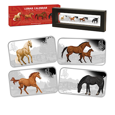 Es handelt sich hier um das 4er Barren Set zum Jahr des Pferdes, ausgegeben von den Cook Islands und produziert von der Perth Mint Australia. Die aufwendig colorierten Barren kommen in der höchsten Prägequalität Polierte Platte und sind streng limitiert auf nur 3.000 Stück weltweit. |