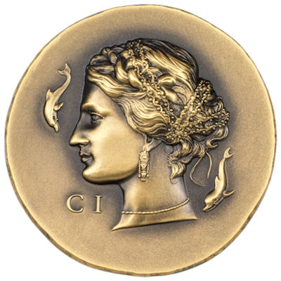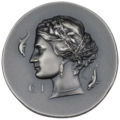 Dies ist die 4. Ausgabe der Serie Numismatische Ikonen und zeigt Arethusa. Eine fesselnde Nymphe und Begleiterin der Mondgöttin Artemis in der griechischen Mythologie.