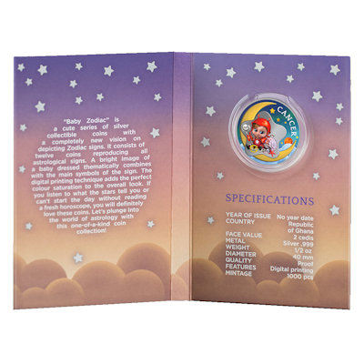 Diese niedlich gestaltete Serie widmet sich den 12 Sternzeichen und wird von Ghana verausgabt. Die 999er Feinsilbermünzen beinhalten 1/2 Oz Silber in der höchsten Prägequalität Polierte Platte, sind aufwendig coloriert und auf nur 10.000 Stück weltweit streng limitiert.