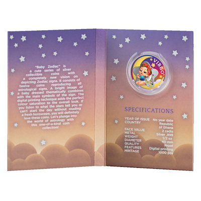 Diese niedlich gestaltete Serie widmet sich den 12 Sternzeichen und wird von Ghana verausgabt. Die 999er Feinsilbermünzen beinhalten 1/2 Oz Silber in der höchsten Prägequalität Polierte Platte, sind aufwendig coloriert und auf nur 10.000 Stück weltweit streng limitiert.
