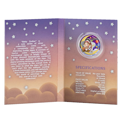 Diese niedlich gestaltete Serie widmet sich den 12 Sternzeichen und wird von Ghana verausgabt. Die 999er Feinsilbermünzen beinhalten 1/2 Oz Silber in der höchsten Prägequalität Polierte Platte, sind aufwendig coloriert und auf nur 10.000 Stück weltweit streng limitiert.
