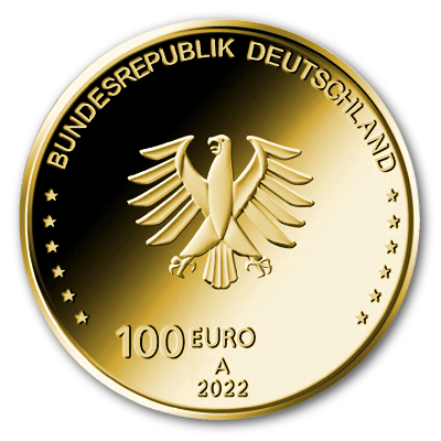 Technische Daten: Ausgabeland: Deutschland Prägeanstalt: Deutschland A, D, F, G, J Ausgabejahr: 2022 Nennwert: 100 EURO Material: Gold Gewicht: 15,55150g Durchmesser: 28,00 mm Auflage: 175.000 Stück Prägequalität: Stempelglanz Verpackung: Gekapselt im Original-Etui mit Echtheitszertifikat |