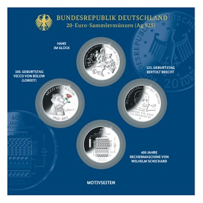 1.) Hans im Glück 2.) 125. Geburtstag Bertold Brecht 3.) 400 Jahre Rechenmaschine von Wilhelm Schickard 4.) 100. Geburtstag von Vicco v. Bülow (Loriot) Nominal: 20 Euro Prägequalität: Spiegelglanz Technische Daten: Ausgabeland: Deutschland Prägeanstalt: Deutschland A, D, F, G, J Ausgabejahr: 2023 Nennwert: 4 * 20 EUR Material: Silber Gewicht: 72,00000g Durchmesser: 32,50 mm Prägequalität: Spiegelglanz Verpackung: In Original-Verpackung |