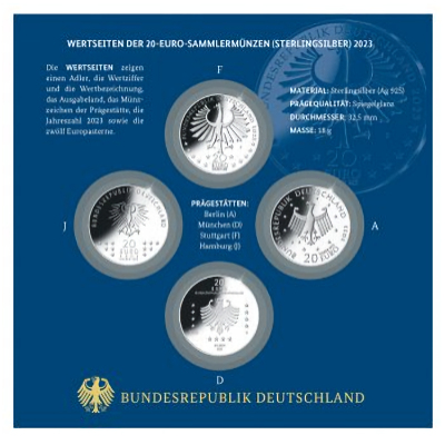 Das Jahresset enthält alle 20-Euro-Sammlermünzen in Sterlingsilber (Ag 925) des Jahres 2023. Es wird voraussichtlich ab Oktober 2023 ausgeliefert.