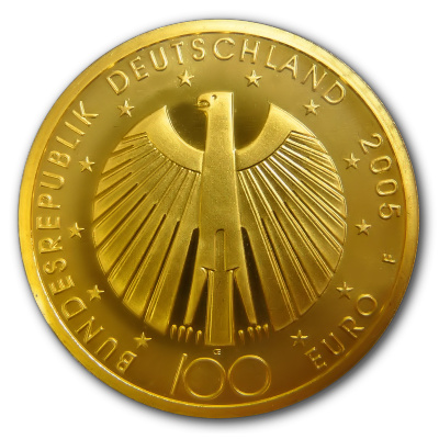 Technische Daten: Ausgabeland: Deutschland Prägeanstalt: Deutschland A, D, F, G, J Ausgabejahr: 2005 Nennwert: 100 EURO Material: Gold Gewicht: 15,55150g Durchmesser: 28,00 mm Dicke: 1,65 mm Auflage: 350.000 Stück Prägequalität: Stempelglanz Verpackung: Gekapselt im Original-Etui mit Echtheitszertifikat |