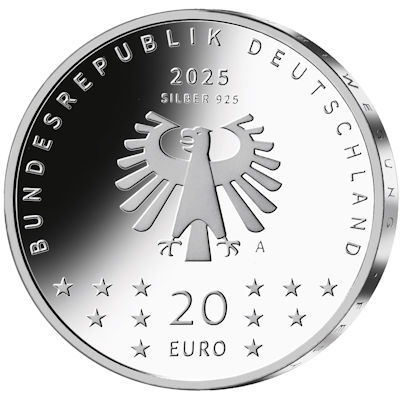 Im Oktober 2015 erschien dann erstmals eine Stempelglanz Euro Gedenkmünze mit einem Nennwert von 25 Euro in reinstem Silber 999/1000 zum Gedenken an 25 Jahre Deutsche Einheit. Ab 2016 startete dann die neue Euro Gedenkmünzen Serie der Bundesrepublik Deutschland nun mit einem Nennwert von 20 Euro und wieder aus Sterlingsilber mit einem Gewicht von 18 Gramm. Beschreibung zur Münze: