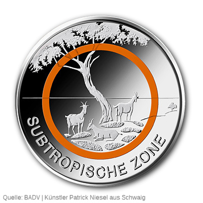 Aufgrund des großen Erfolgs und der starken Nachfrage der 5 Euro Planet Erde Münze wurde beschlossen, eine 5-teilige Serie über 5 Jahre hinweg zu verausgaben mit dem Motto Klimazonen der Erde. Die Farbe des Polymer-Rings variiert hier die Farbe je nach Klimazone. Folgende Ausgaben sind geplant: 2017: Tropische Zone (Farbe Rot) 2018: Subtropische Zone (Farbe Orange) 2019: Gemäßigte Zone (Farbe Grün) 2020: Subpolare Zone (Farbe Türkis) 2021: Polarzone (Farbe Violett) Auch diese Ausgaben erscheinen von allen 5 Deutschen Prägeanstalten in der Variante Stempelglanz sowie als Spiegelglanz im Sammleretui. Beschreibung zur Münze: