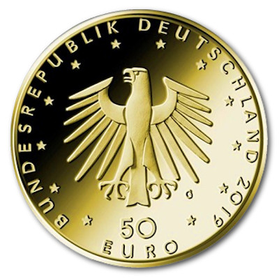 Technische Daten: Ausgabeland: Deutschland Prägeanstalt: Deutschland A, D, F, G, J Ausgabejahr: 2019 Nennwert: 50 Euro Material: Gold Gewicht: 7,77575g Durchmesser: 20,00 mm Auflage: 150.000 Stück Prägequalität: Stempelglanz Verpackung: Im Original-Etui mit Umverpackung |