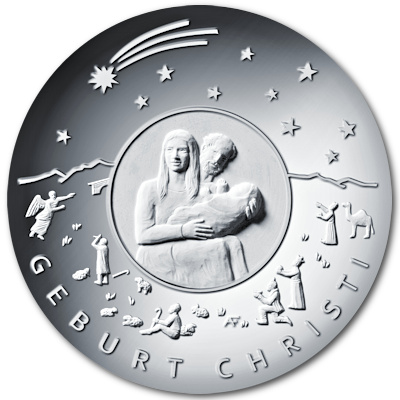 Im Jahr 2021 verausgabt Deutschland diese 25 Euro Silbermünze mit dem Weihnachtsmotiv Geburt Christi. Die Ausgabe ist in Spiegelglanz geprägt und auf maximal 150.000 Stück weltweit limitiert. Die Auslieferung erfolgt gekapselt im Originalblister. Die Kapsel enthält eine Öse, mit dieser kann die Münze bei Wunsch beispielsweise an einem Weihnachtsbaum aufgehängt werden. Alle Münzen sind von der Prägestätte Hamburg (J) geprägt. Die Künstlerin des Motivs ist Adelheid Fuss, Potsdam. © Foto-Quelle Bundesverwaltungsamt (BVA); Künstlerin: Adelheid Fuss, Potsdam; Fotograf: Hans-Joachim Wuthenow, Berlin