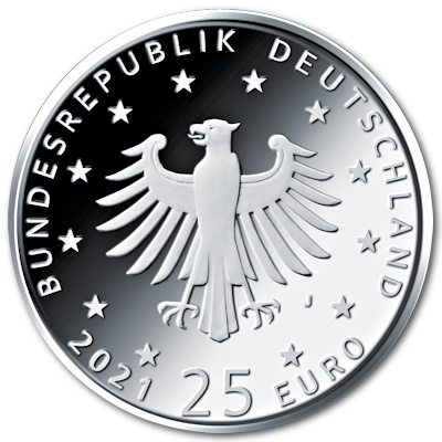 Technische Daten: Ausgabeland: Deutschland Prägeanstalt: Deutschland A, D, F, G, J Ausgabejahr: 2021 Nennwert: 25 Euro EUR Material: Silber Gewicht: 22,00000g Durchmesser: 30,00 mm Auflage: 150.000 Stück Prägequalität: Spiegelglanz Verpackung: Gekapselt im Blister mit Öse |