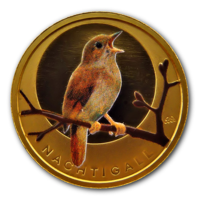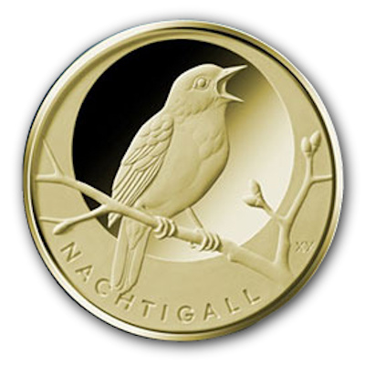 Die Nachtigall ist die 1. Ausgabe der neuen Serie 20 Euro Goldmünzen -Heimische Vögel-. |