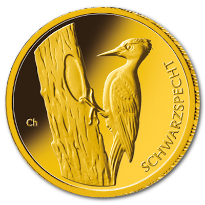 Der Schwarzspecht ist die 6. Ausgabe der Serie 20 Euro Goldmünzen -Heimische Vögel-. Bilder Copyright bei BVA. Künstler der Bildseite: Frantisek Chochola, Hamburg, Künsterlin der Wertseite: Adelheid Fuss, Potsdam. Fotograf: Hans-Jürgen Fuchs, Stuttgart. Auflage 40.000 Stück pro Prägeanstalt (München, Stuttgart, Karlsruhe, Frankfurt, Berlin) |