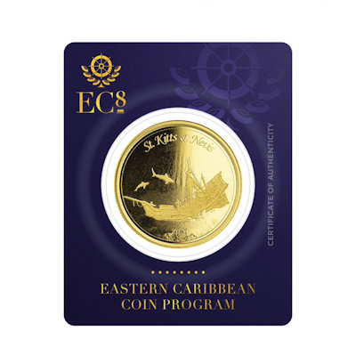 Die Scottsdale Mint freut sich, in Zusammenarbeit mit der Eastern Caribbean Central Bank (ECCB) das EC8-Programm mit der Veröffentlichung der Ausgabe St. Kitts 2021 Versunkenes Schiff (Sunken Ship) fortzusetzen. Es ist die 8. Ausgabe der 4. EC8 Serie. Es handelt sich hier um die Ausgabe in 1 Oz Feingold verpackt und sicher geschützt in Certi-Lock(R) Verpackung!