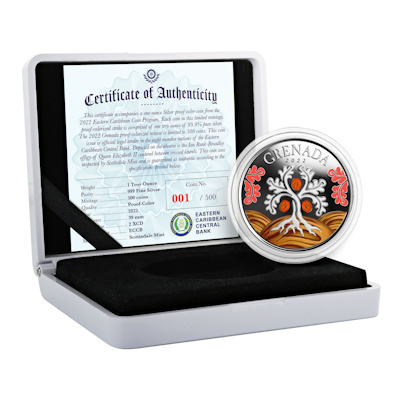 Die Scottsdale Mint verausgabt mit der Eastern Caribbean Central Bank (ECCB) das EC8-Programm. Es handelt sich mit den Ausgaben 2022 bereits um die 5. Ausgabe dieser wunderschönen Serie. Die zweite Ausgabe der 2022er Serie kommt aus Grenada und zeigt den Muskatnussbaum (Nutmeg Tree).